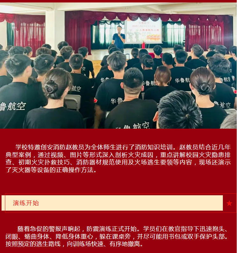 以“演”促防 用“练”提效——华鲁航空学校开展“共建美好校园”安全教育专题讲座、防火防震演练活动